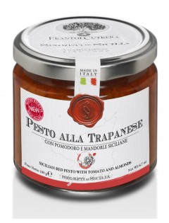SICILIAN RED PESTO (TRAPANESE) WITH TOMATO AND ALMONDSBrand: SEGRETI DI SICILIAPesto alla Trapanese is a traditional condiment from the Sicilian province of Trapani. Made by grinding tomatoes and almonds with spices and Frantoi Cutrera extra virgin olive oil, this red pesto has a creamy texture and a rich, intense flavor. Perfect for pasta dishes—particularly Busiate—it can also be enjoyed on bruschetta, in sandwiches, or as a dip for grissini (Italian breadsticks). |