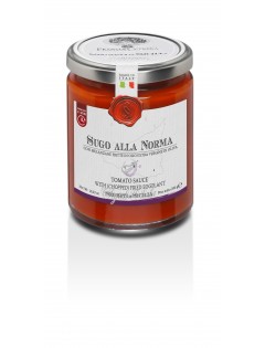 SUGO ALLA NORMA - TOMATO SAUCE WITH CHOPPPED FRIED EGGPLANTBrand: SEGRETI DI SICILIAA classic recipe from the south-eastern part of Sicily, Sugo alla Norma is a tomato sauce made with chopped, fried eggplants. Prepared with the highest quality selected ingredients, this sauce combines tomato sauce and chopped eggplants with Frantoi Cutrera extra virgin olive oil, basil, and chili pepper. Pair it with pasta like spaghetti or rigatoni, and top with grated ricotta salata to create the classic Pasta alla Norma dish. |