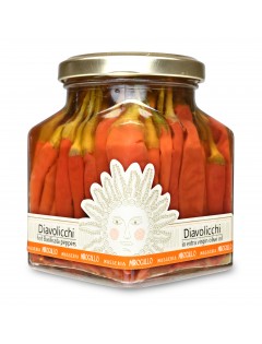 DIAVOLICCHI HOT PEPPERS IN EVOOBrand: MASSERIA MIROGALLOBasilicata, just like the regions of Calabria and Puglia, is identified by the omnipresence of peppers in cooking. The Belfiore family of Masseria Mirogallo hand picks these 2 to 3 inch long peppers and carefully packs 50 to 60 peppers into a jar along with wine vinegar and extra virgin olive oil produced entirely at their farm. The name Diavolicchi derives from the word diavolo, meaning devil, becuase these peppers are said to be hotter than hell. One bite will ignite your taste buds, fire tingling your lips and palate before culminating in a pleasant sweet finish. |