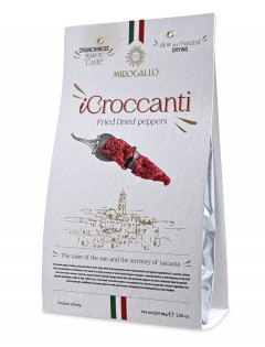S/O CROCCANTI CRUSCHI PEPPER - FRIED DRIED PEPPERSBrand: MASSERIA MIROGALLOA traditional product of Lucania, Mirogallo dried peppers are made with a local pepper varietal that has a thin skin, making them ideal for drying. Harvest takes place from late July through late September. After harvesting, the peppers are strung together to form a 'necklace' and are dried in the sun for 20-25 days. They are then fried in extra virgin olive oil (also produced at the farm) and packaged for shipment |