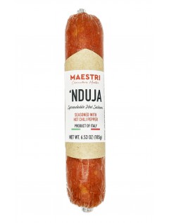 'NDUJABrand: MAESTRISeasoned with hot chili pepper. Nduja is the famous spreadable hot salami from Calabria (Italy), made using pork meat and fat cuts chopped together. Sweet and chili peppers are mixed to other ingredients and then the product is bagged in case and hang up to let it dry. |